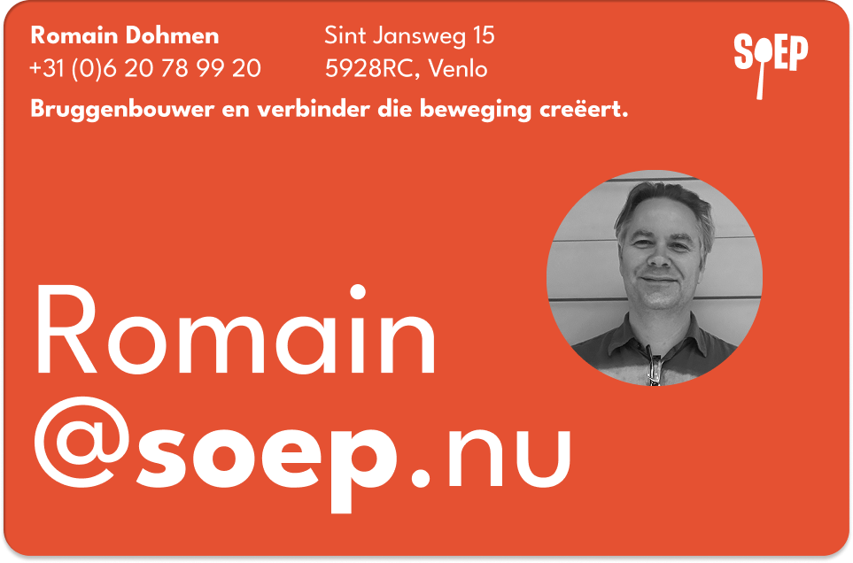 Bij SOEP vertalen we complexe vraagstukken naar concrete, werkbare oplossingen. Als creatieve denkers en praktische doeners geloven we in de kracht van samenwerking en innovatie. In alles wat we doen, zetten we in op betrokkenheid. Zowel van de mensen die het betreft als van de professionals die samen met ons de uitdaging aangaan – we werken samen met diegenen die het écht aangaat. Van jongeren in Heerlen die via een game hun afvalgedrag veranderen, tot de bewoners van Geleen-Zuid die met elkaar de toekomst van hun wijk bepalen.